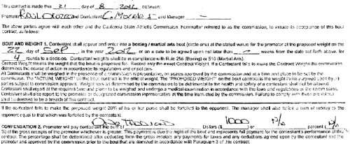 You’ll notice that the promoter listed on the contract is Raul Orozco. He was supposed to be the one to sign the bout contracts at the weigh-ins. Instead, Armando Renteria (not listed as the promoter on the contract) signed the bout contracts that CSAC approved.